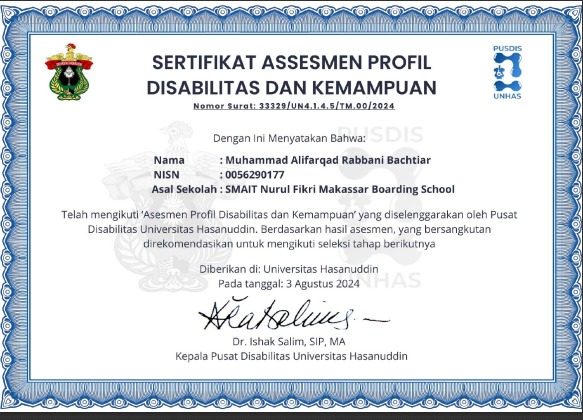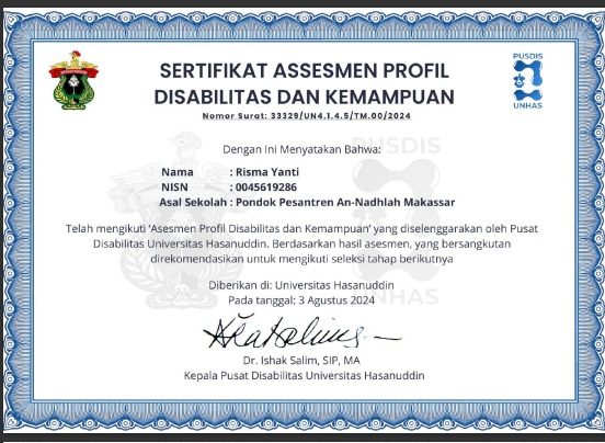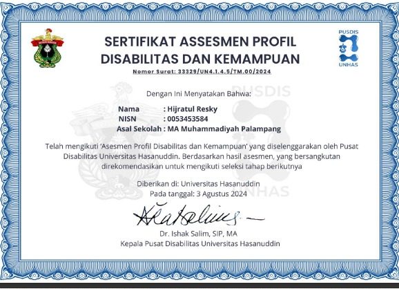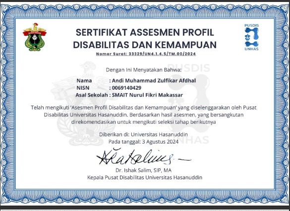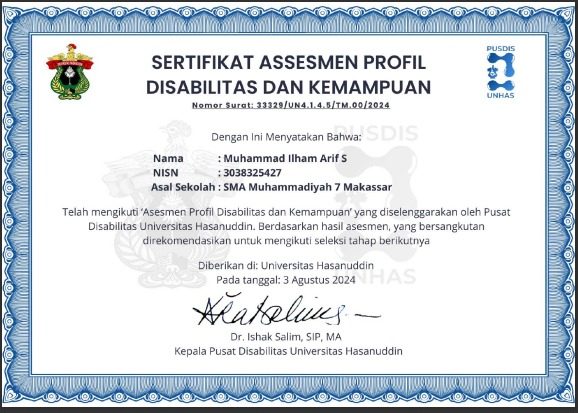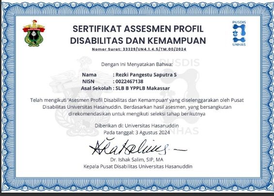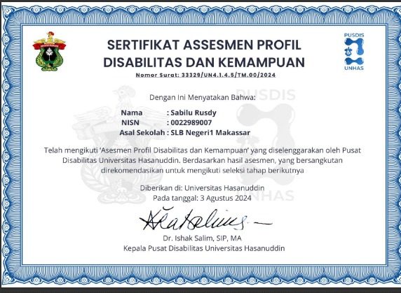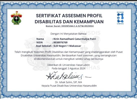 Berikut Hasil Asesmen Disabilitas dan Kemampuan. Kami tidka melampirkan hasil detailnya, hanya sertifikat saja.